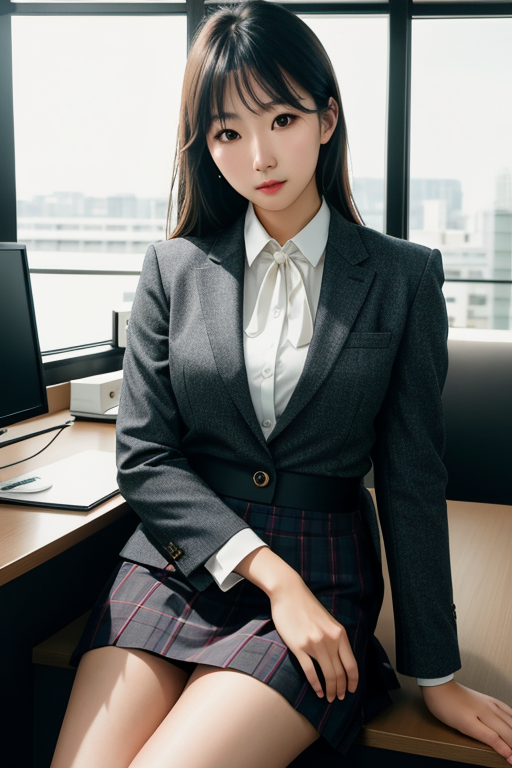 このシリーズの魅力は、ストッキングの電線や、デスクの木目の質感、キーボードのテカリといった「生活感」の徹底した作り込みにあります。あまりにもリアルな背景が、AI美女の存在感をさらに際立たせ、まるで彼女が隣のデスクに実在しているかのような錯覚さえ抱かせます。知的でミステリアスな、大人のための官能がここにあります。